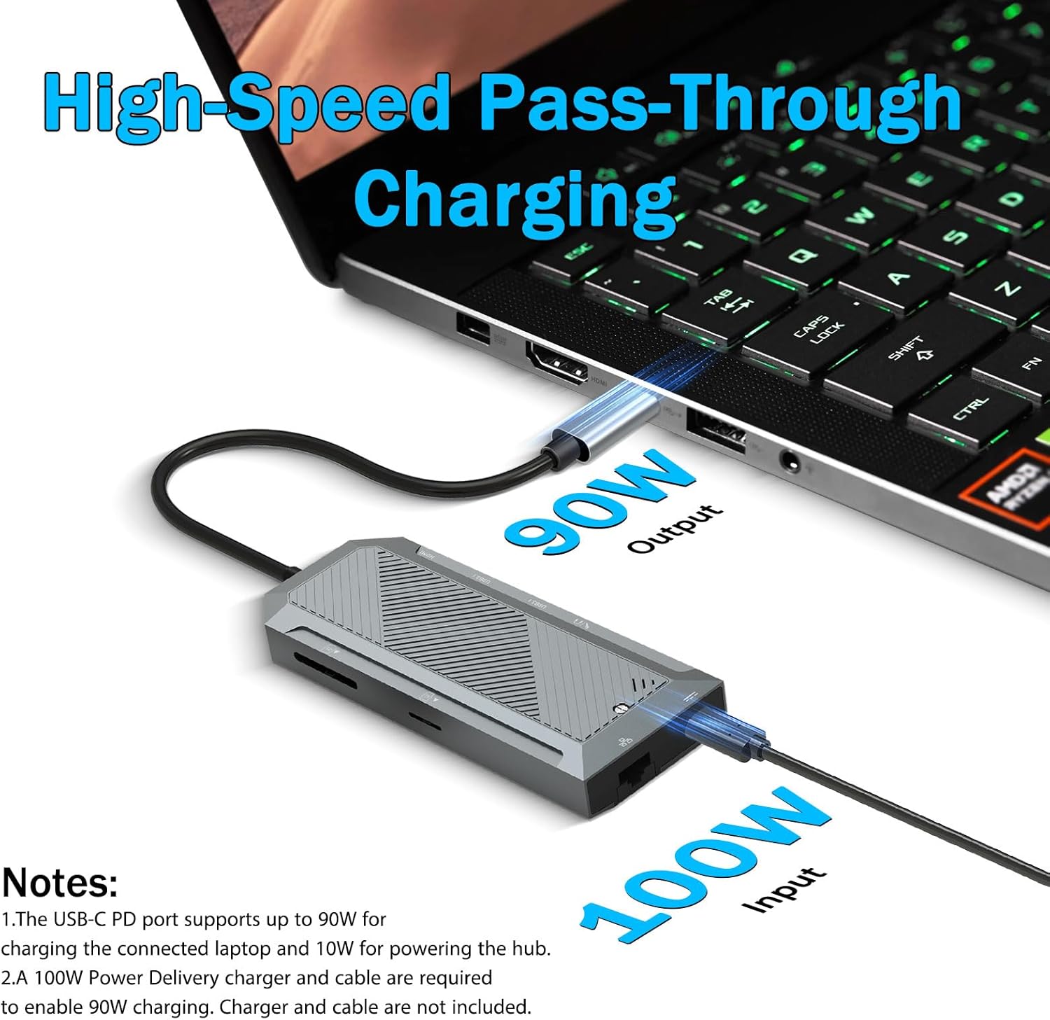 M.2 NVMe 4K 60Hz HDMI Splitter үчүн SSD корпусу менен 9-да 1 USB-C хабы - бул ноутбуктардын, планшеттердин жана башка USB-C шайкеш түзүлүштөрдүн туташуусун жакшыртуу үчүн иштелип чыккан көп функциялуу кеңейтүү түзмөгү. Ал тогуз маанилүү функцияны бирдиктүү компакттуу бирдикке бириктирип, колдонуучуларга жогорку ылдамдыктагы маалыматтарды берүүнү жана ишенимдүү кубаттуулукту камсыздоо менен бир нече перифериялык түзүлүштөрдү туташтырууга мүмкүндүк берет.