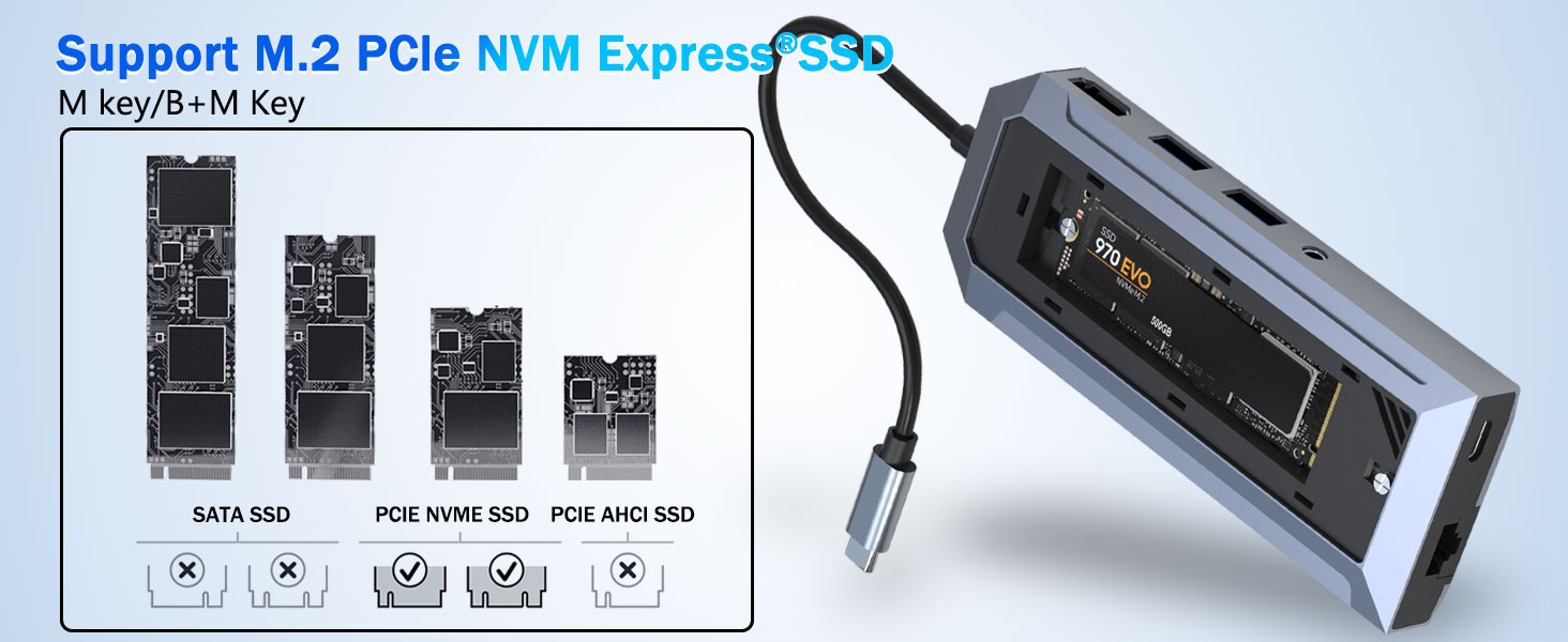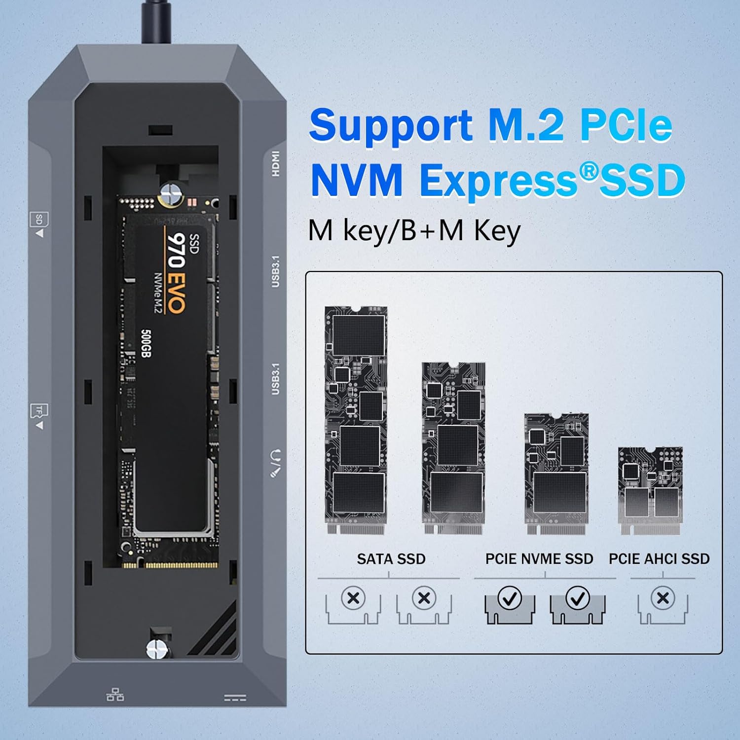 Салттуу USB хабдарынан айырмаланып, бул аппарат M.2 NVMe катуу абалдагы дисктерди колдогон атайын SSD корпусун камтыйт. Бул өзгөчөлүк колдонуучуларга өзүнчө тышкы дискти талап кылбастан, жогорку ылдамдыктагы сактагычты түздөн-түз жумуш мейкиндигине кошууга мүмкүндүк берет.