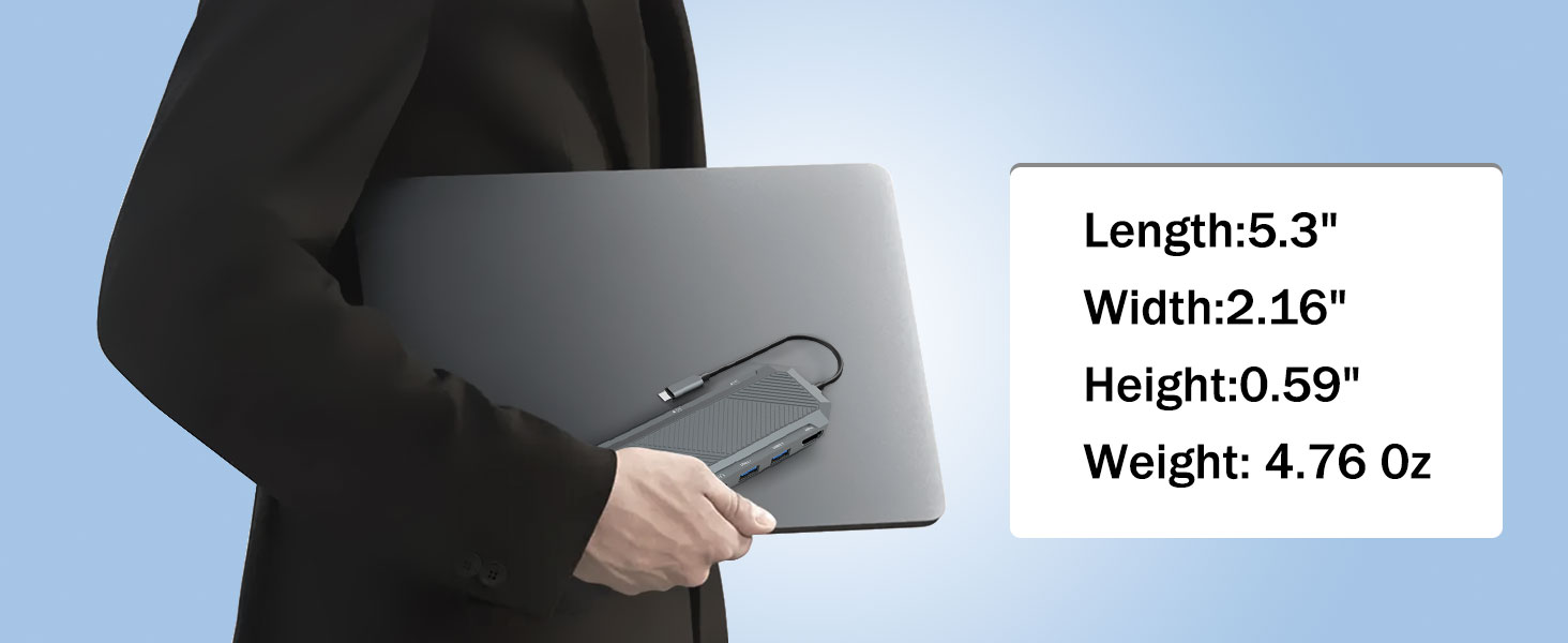Күчтүү функционалдуулугуна карабастан, M.2 NVMe 4K 60Hz HDMI Splitter үчүн SSD корпусу менен 9-ин-1 USB-C хабы компакттуу жана жеңил бойдон калуу үчүн иштелип чыккан. Бул ноутбук сумкаларында, рюкзактарда же саякат кутуларында алып жүрүүнү жеңилдетет.