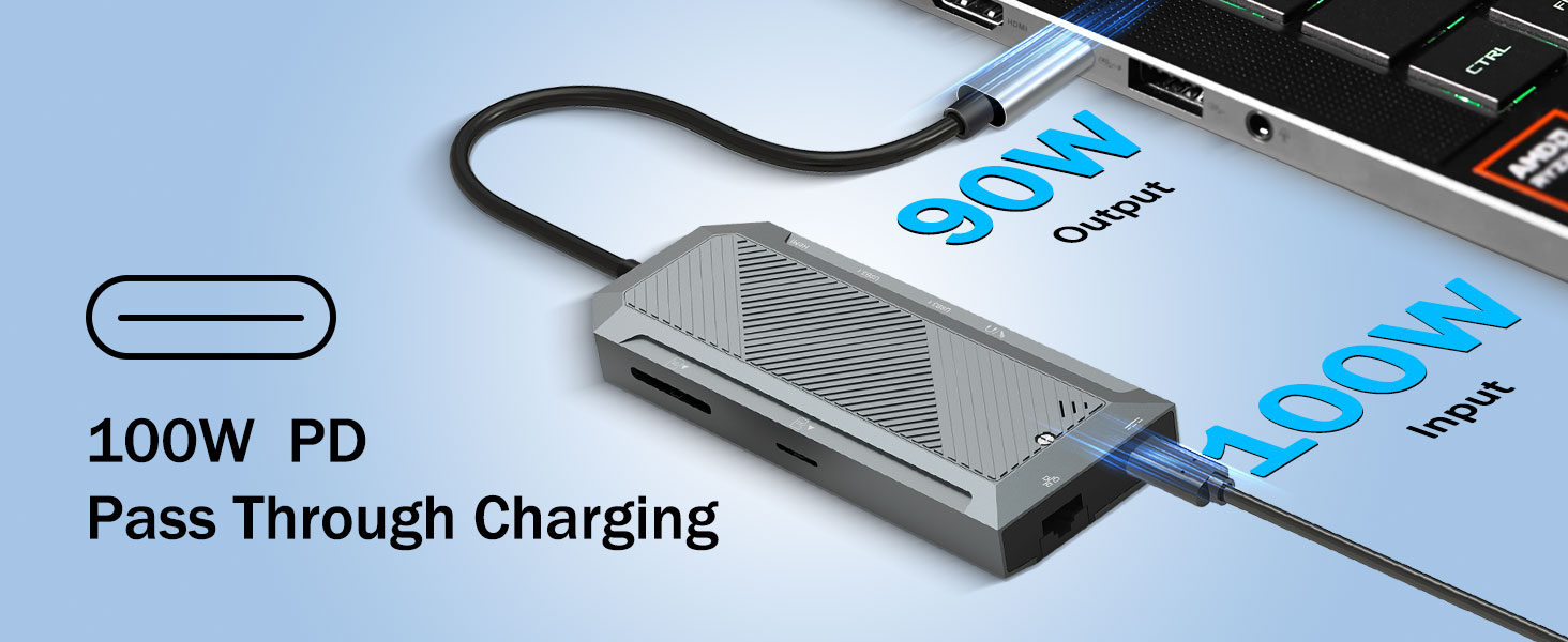 Кубат жеткирүү колдоосу хаб колдонулуп турганда түзмөктөр кубатталган бойдон калуусун камсыздайт. USB-C PD порту кубаттуулукту хаб аркылуу жана туташкан ноутбукка же планшетке өткөрүүгө мүмкүндүк берет.