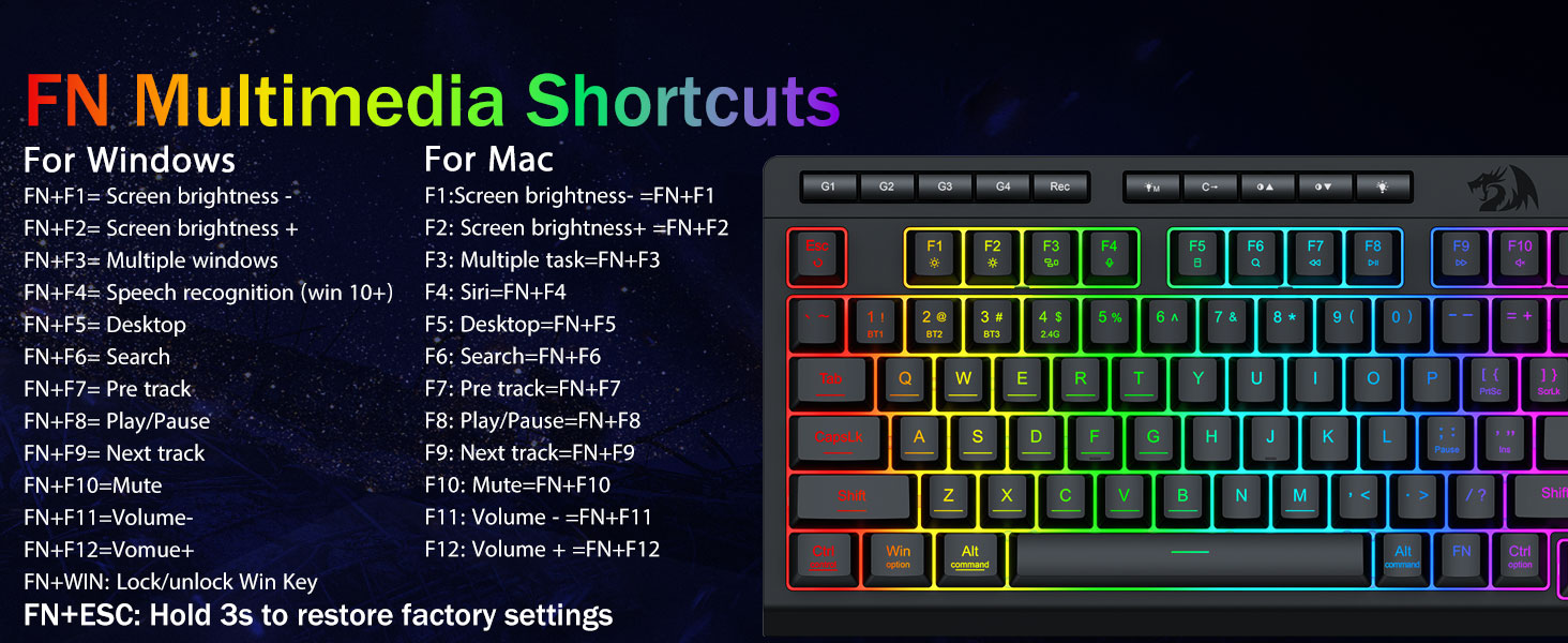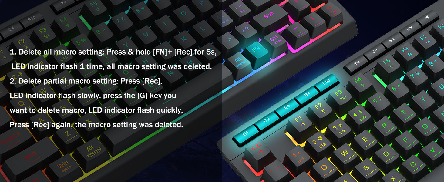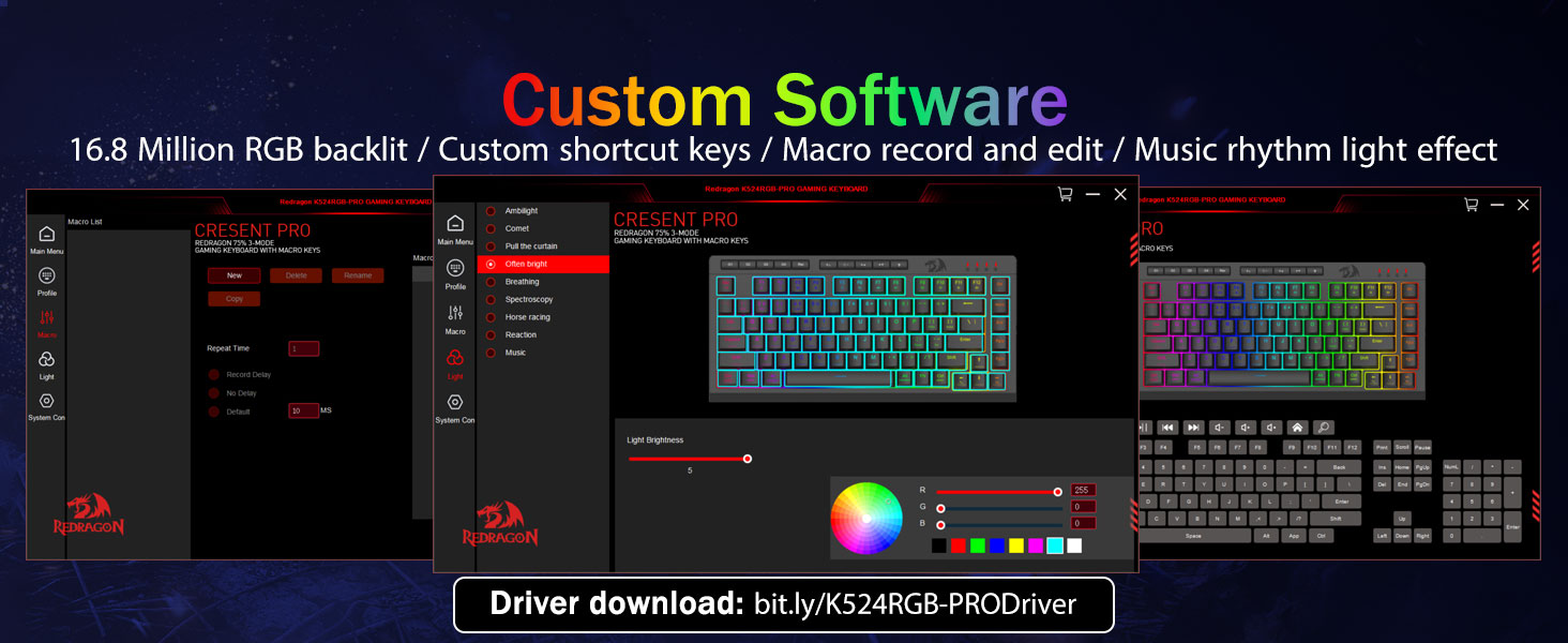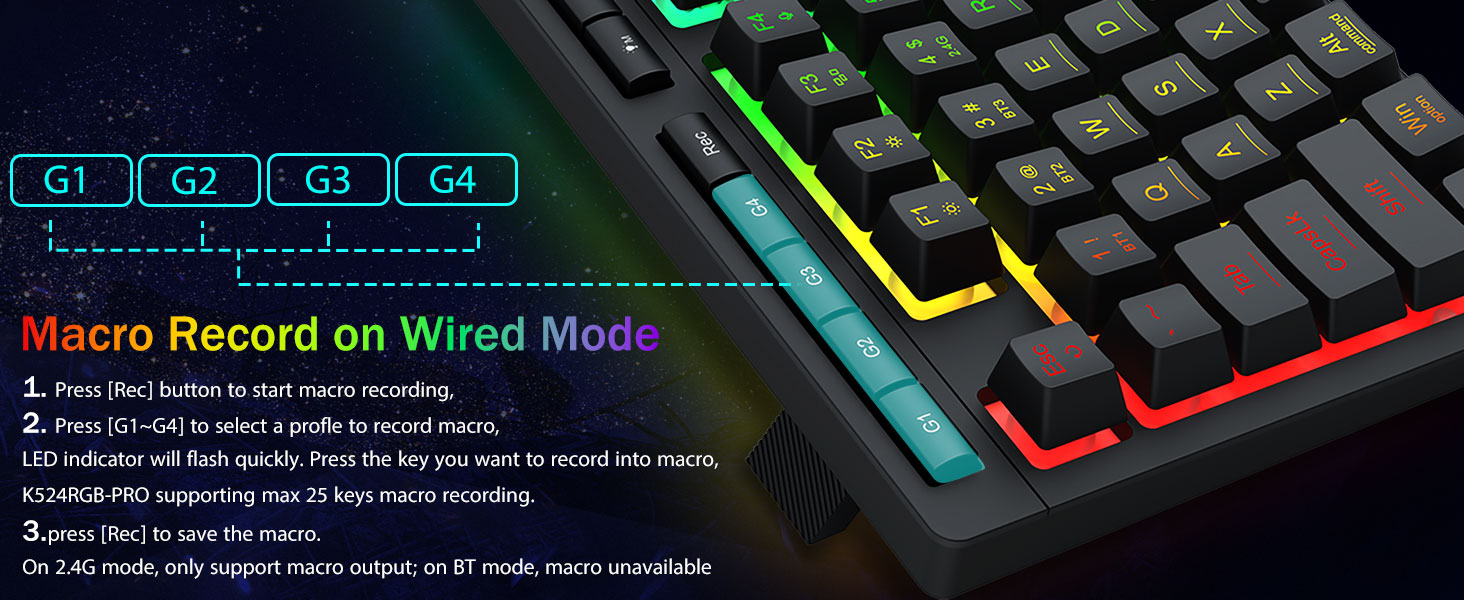 Программа Шилтеме: bit.ly/k524rgb-prodriver- Macro Keys (G1-G4) Комплекстүү комплекстүү комболор, өндүрүмдүүлүктүн же ММК буйруктары үчүн жарлыктар үчүн жарлыктар үчүн. Жумушуңузду бир нече секунддан кийин калыбына келтирүү. Ошондой эле сиз функцияларды ыңгайлаштыруу үчүн программаны колдонсоңуз болот, макрос түзүп, RGB чырактарын тууралап, жарлыктарды белгилеңиз.