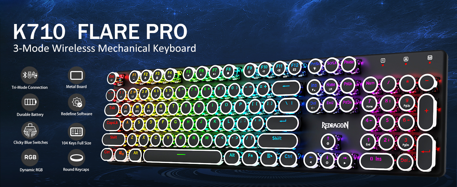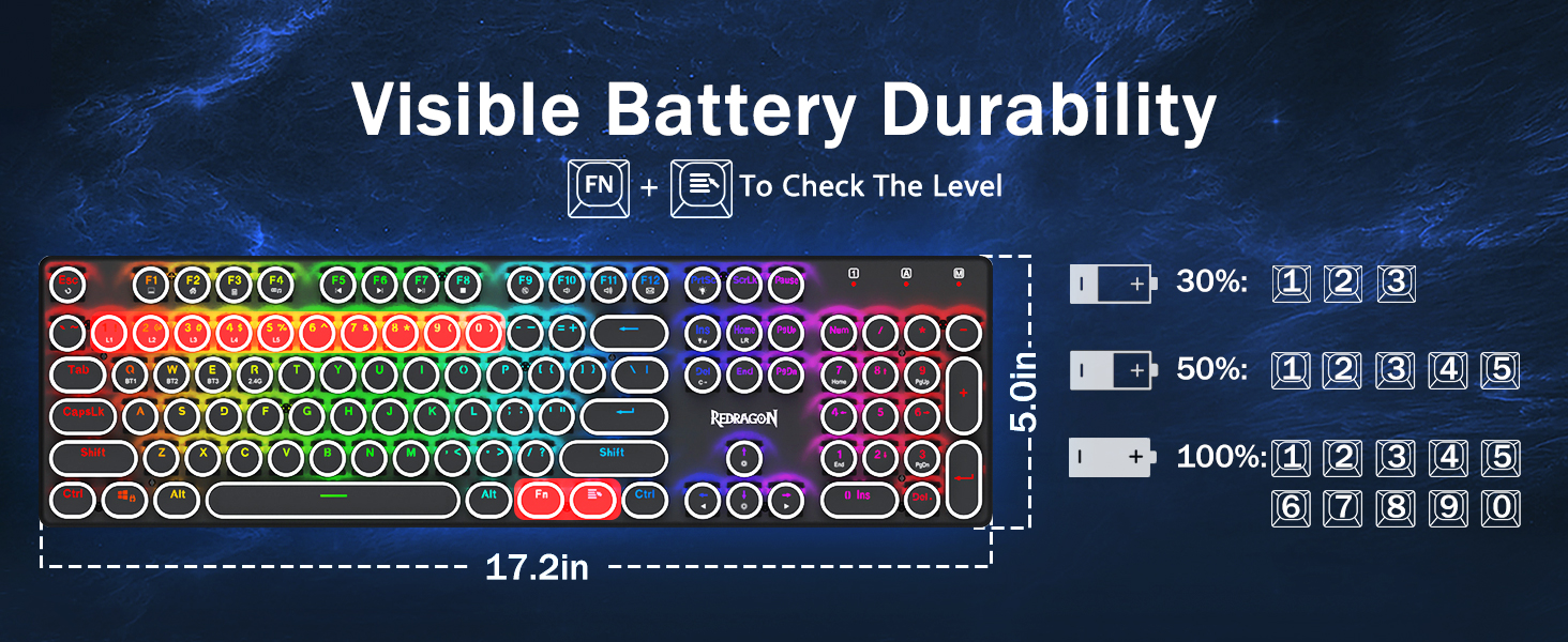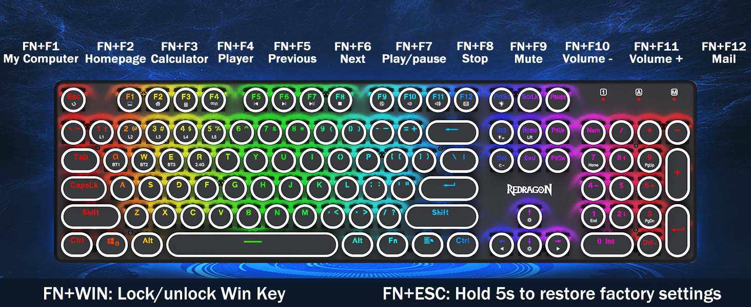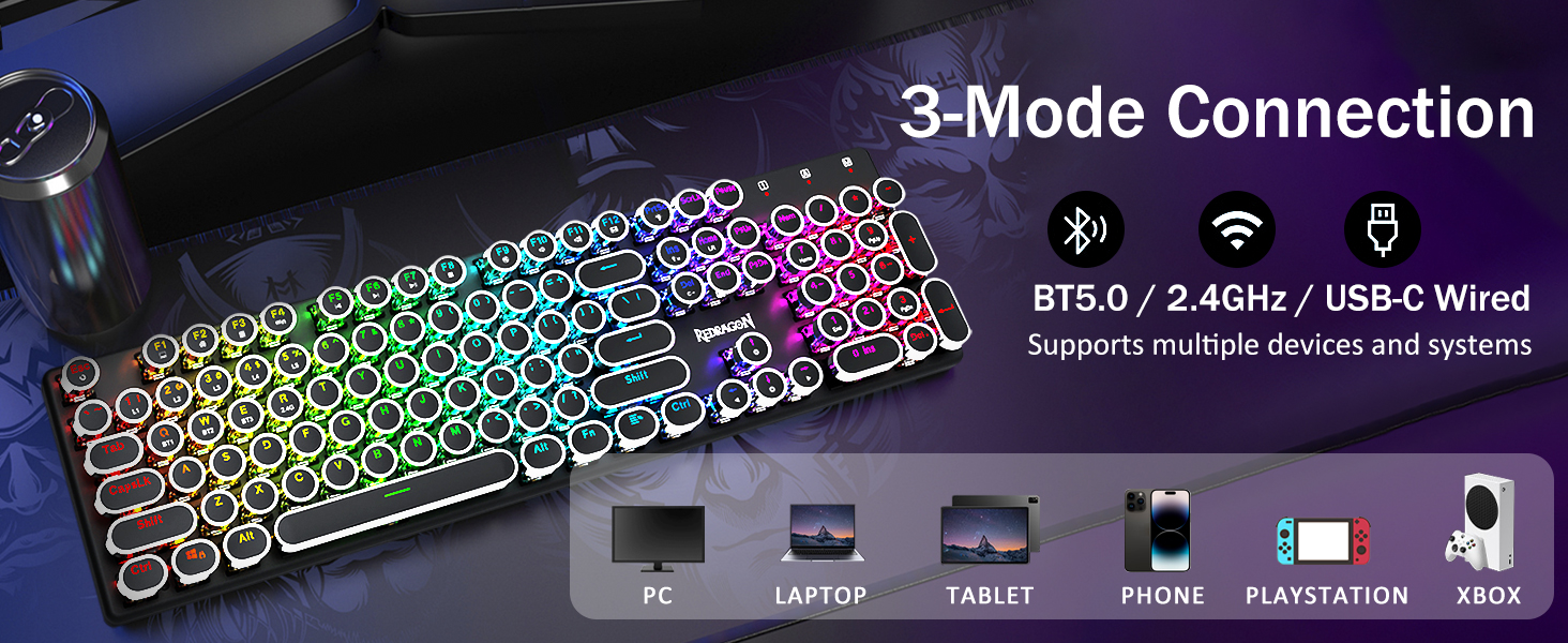 𝟯-𝗠𝗼𝗱𝗲 𝗖𝗼𝗻𝗻𝗲𝗰𝘁𝗶𝗼𝗻 -Redragon Innovative Tri-Modi туташуу технологиялары менен, USB-C Зымдуу, Bluetooth 5.0 / 3.0 & 2.4ghz зымсыз режимдер, колдонуучу тажрыйбасын бардык тармактардагы башка деңгээлге көтөрөт. Bluetooth режимине FN + Q / W баскычын басып, FN + R баскычын 2.4G режимине чейин басыңыз.