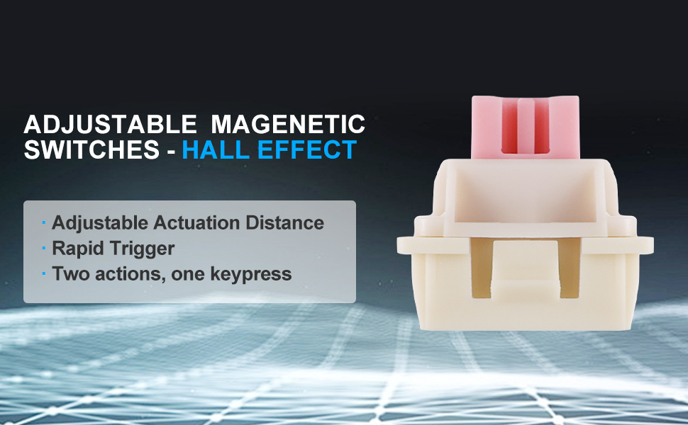 Ак/Көк-Кара K701 Rapid Trigger 60% Зымдуу магниттик которуу механикалык оюн клавиатурасы ар кандай колдонуучунун каалоолоруна ыңгайлашкан жооп терүү тажрыйбасын сунуштайт. Жөнгө салынуучу кыймылдаткыч чекиттери колдонуучуларга алардын муктаждыктарына жараша сезгичтикти тактоо мүмкүнчүлүгүн берет.