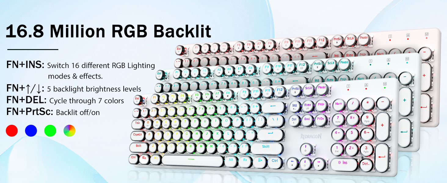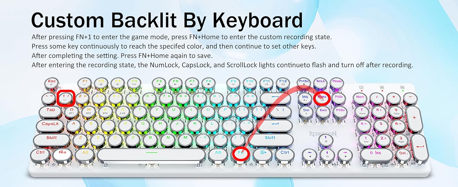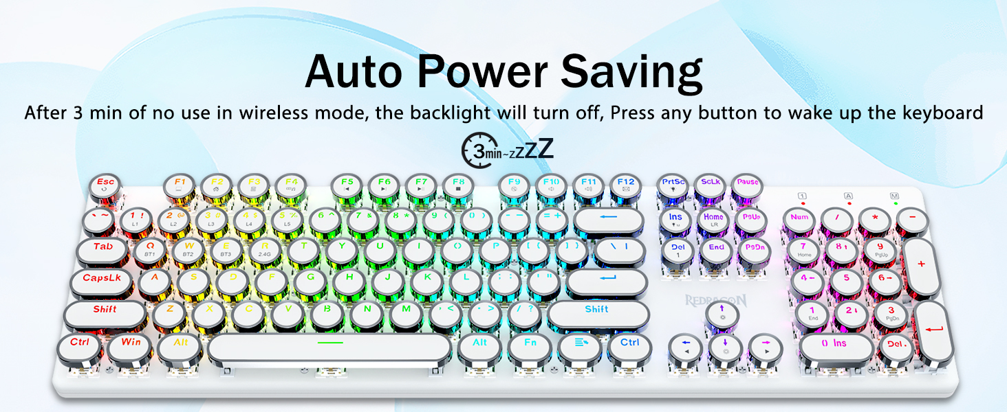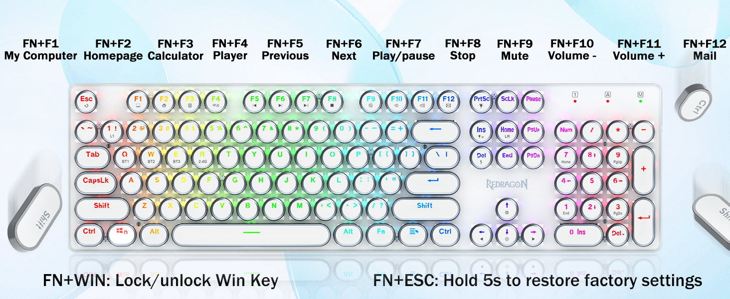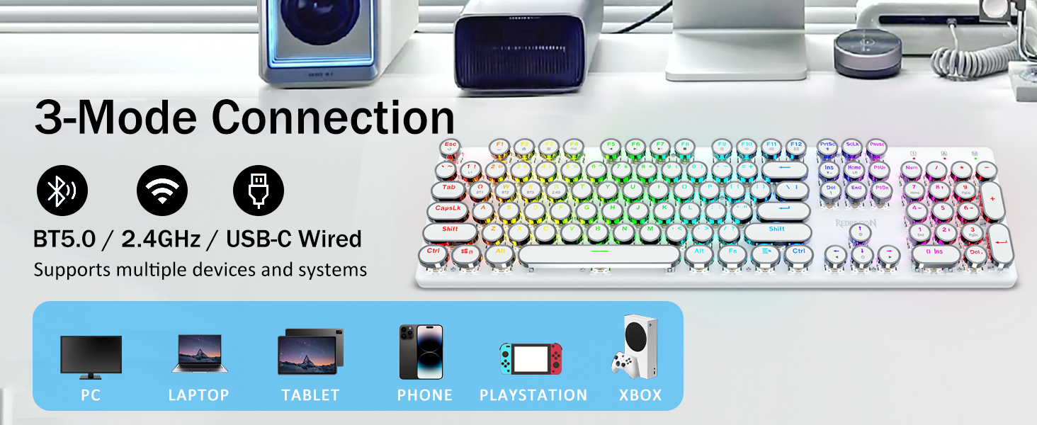𝟯-𝗠𝗼𝗱𝗲 𝗖𝗼𝗻𝗻𝗲𝗰𝘁𝗶𝗼𝗻- Redragon Innovative Tri-Mounda туташуу технологиялары менен, USB-C Зымдуу, Bluetooth 3.0 / 5.0 & 2.4Ghz зымсыз режимдер, ал колдонуучу тажрыйбасын бардык тармактардагы башка деңгээлге көтөрөт. Bluetooth режимине FN + Q / W баскычын басып, FN + R баскычын 2.4G режимине чейин басыңыз.