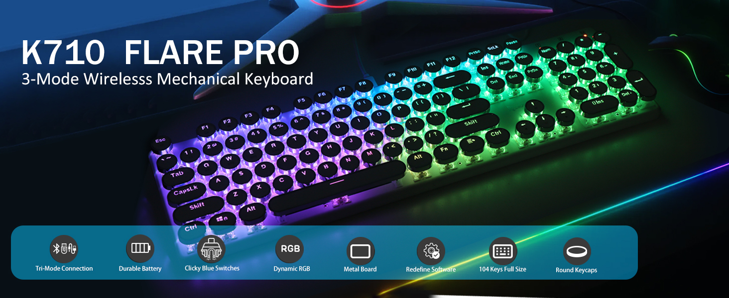𝗗𝗲𝗽𝗲𝗻𝗱𝗮𝗯𝗹𝗲 𝗠𝗲𝘁𝗮𝗹𝗠𝗲𝘁𝗮𝗹 & 𝟭𝟬𝟰 𝗞𝗲𝘆𝘀 𝗔𝗻𝘁𝗶 𝗚𝗵𝗼𝘀𝘁𝗶𝗻𝗴- Жаңыланган Flare Pro версиясы ошол эле танк-катуу металл материалын колдонот. Премиум терүү үчүн столдун үстүндө баскычтопту туруктуу жана көрктүүнү сактаңыз. K710 Keyboard колдоосу 104-баскычыга каршы күрөшүү технологиясы, бир нече баскычтарга бир эле учурда чыр-чатаксыз басылууга мүмкүндүк берет.